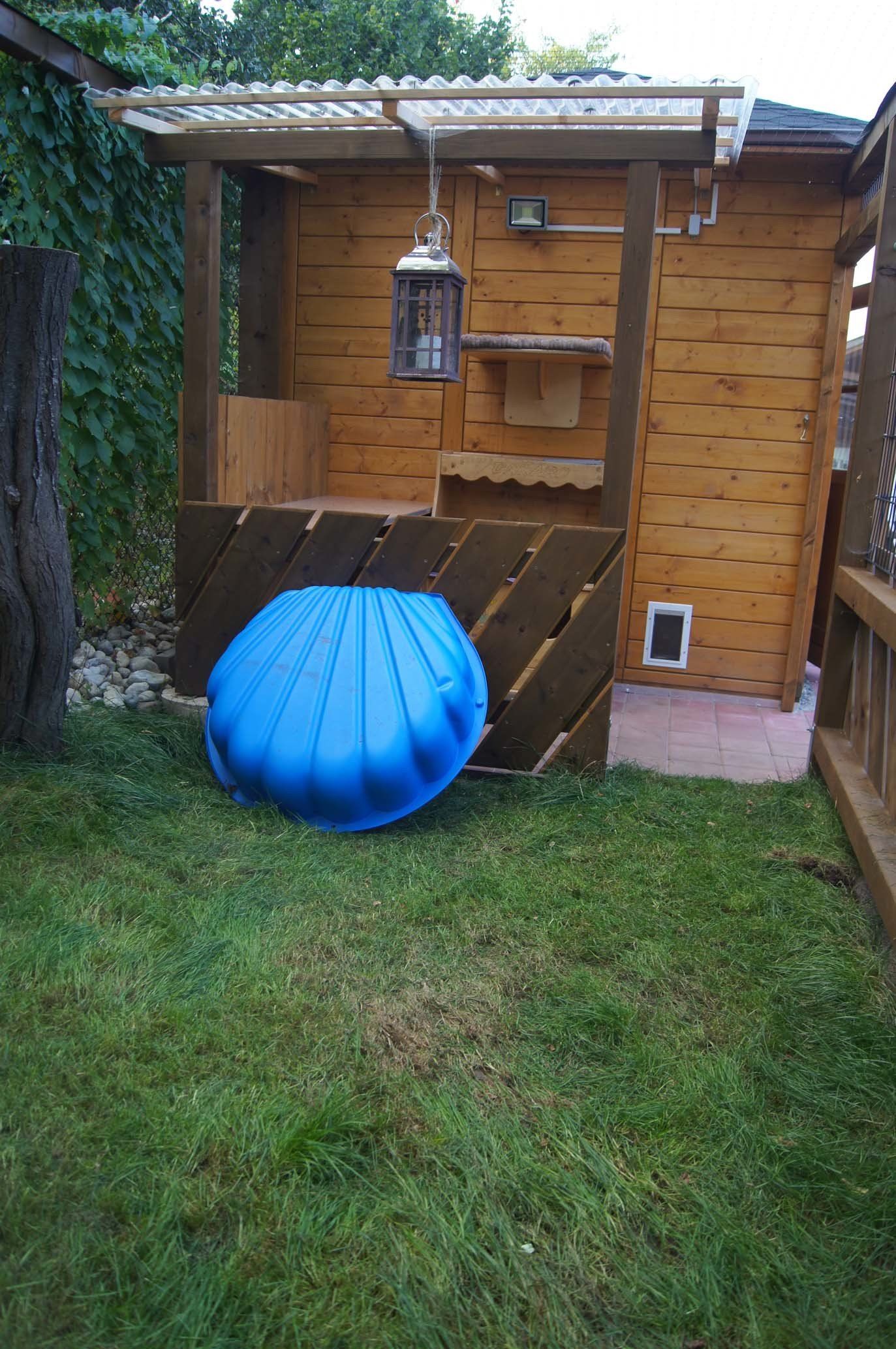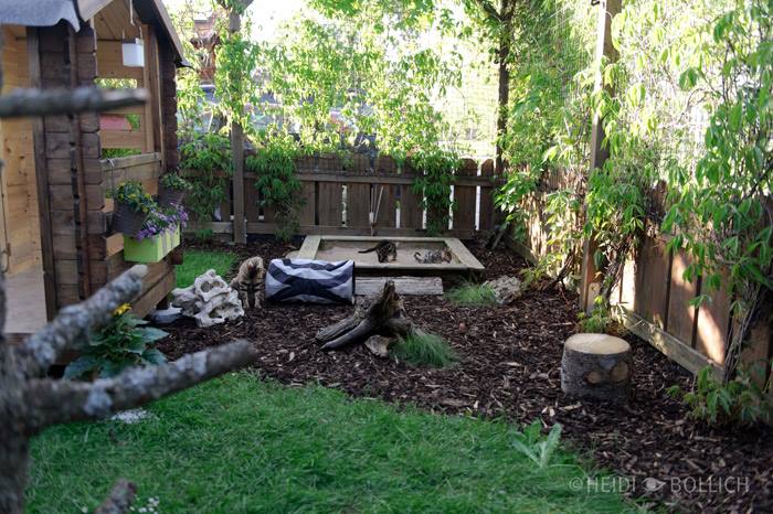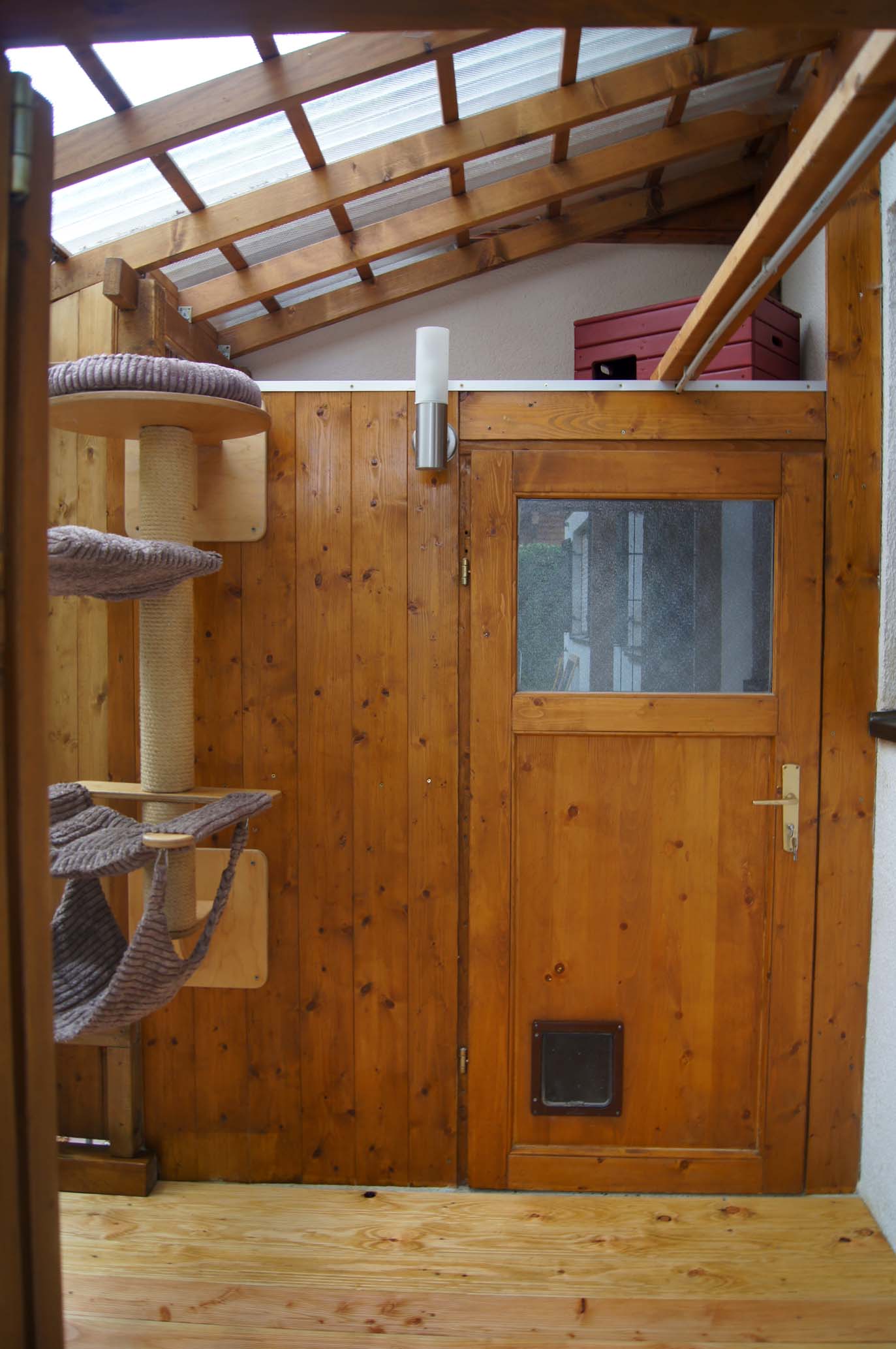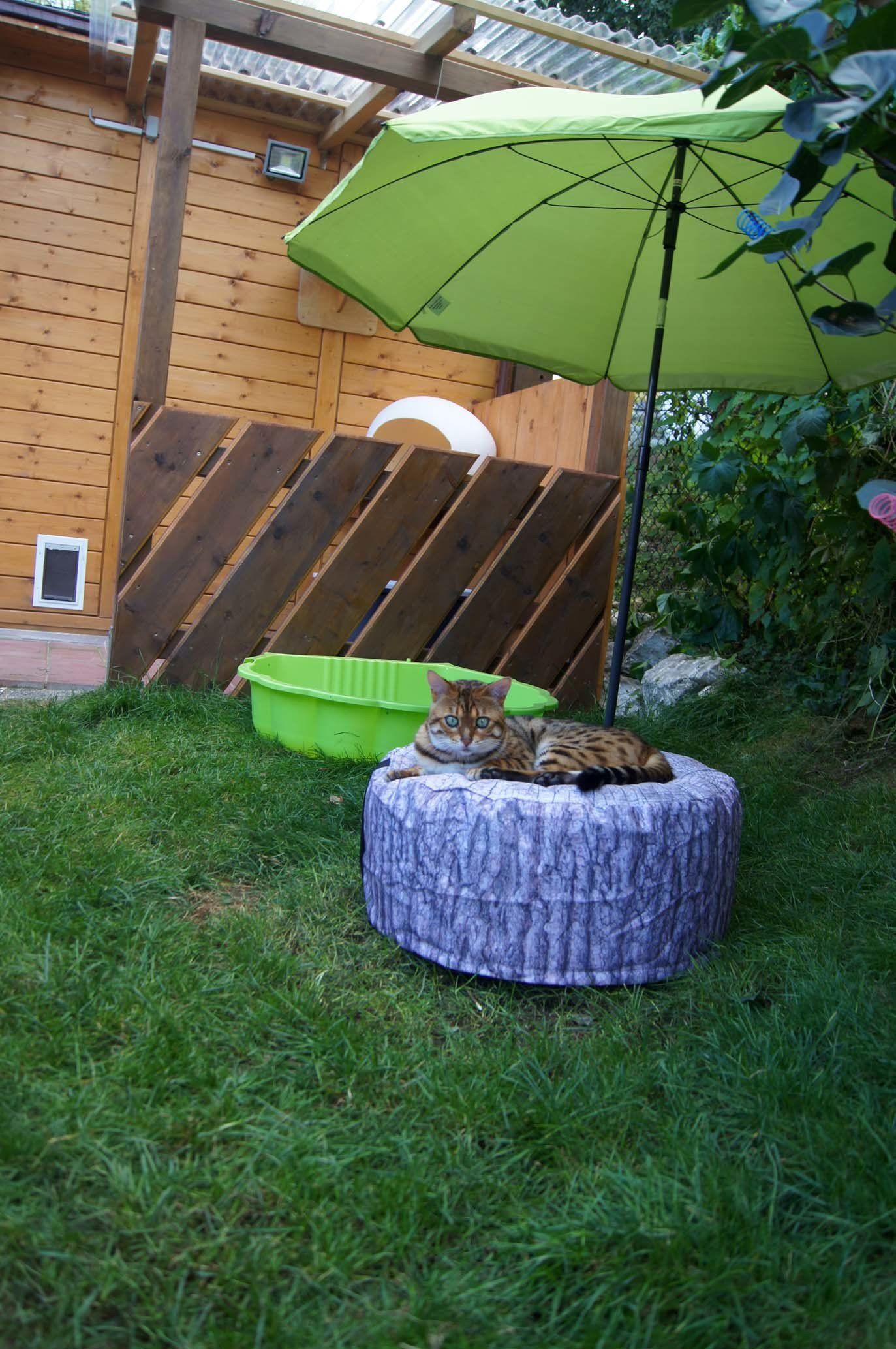 Uns ist es wichtig, dass alle Zuchtkatzen Zugang zu einer Frischluftzone haben. Daher gibt es von der Küche eine Katzenklappe, die in den gesicherten Garten führt. Mädels und Jungtiere leben zusammen mit uns im Haus und können den Katzengarten jederzeit genießen. Für Mamas mit kleinerem Nachwuchs gibt es ein eigenes Kittengehege.